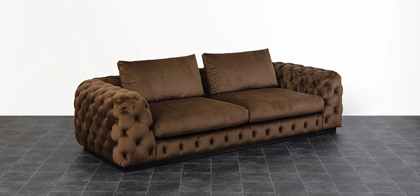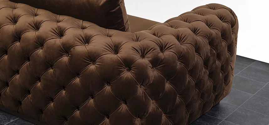 UGO ELEGANCE最大の特徴は、背・肘の両面に施されたボタン締め装飾。 伝統的なクラフトマンシップを活かしながら、滑らかな曲線と低重心のフォルムがモダン空間にも調和するデザインです。 置くだけで空間に重厚感と優雅さをもたらし、まるでホテルラウンジのような格別の雰囲気を演出します。