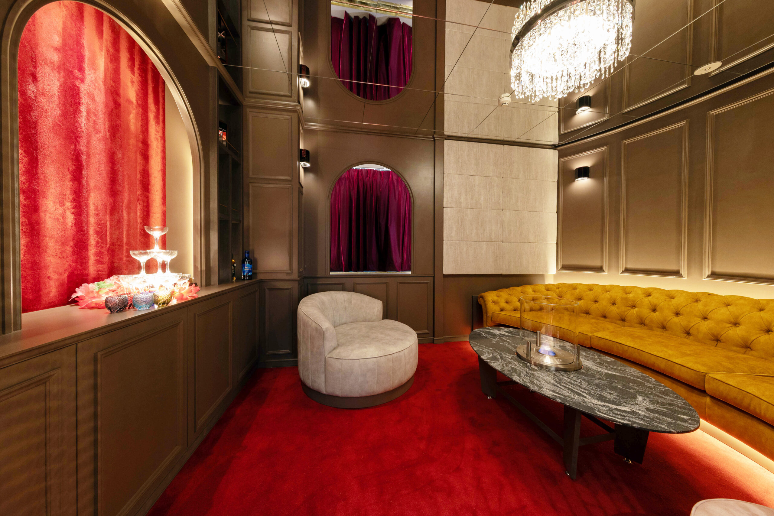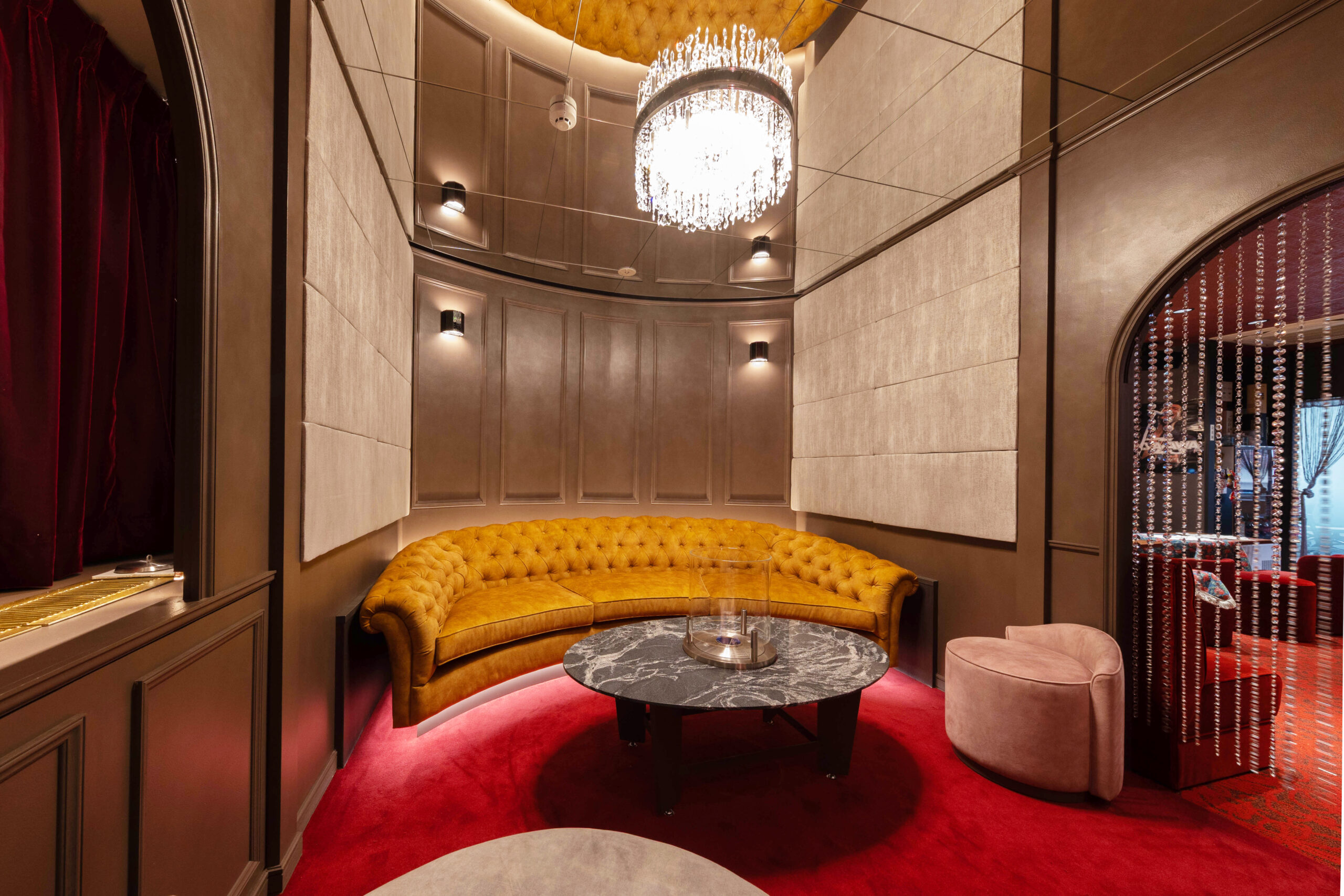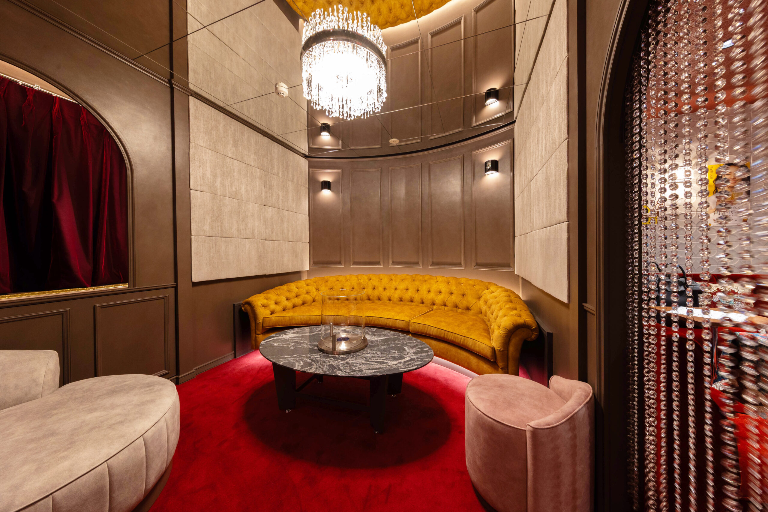 深い赤のカーペットとシャンデリアの煌めきがソファを美しく照らし、