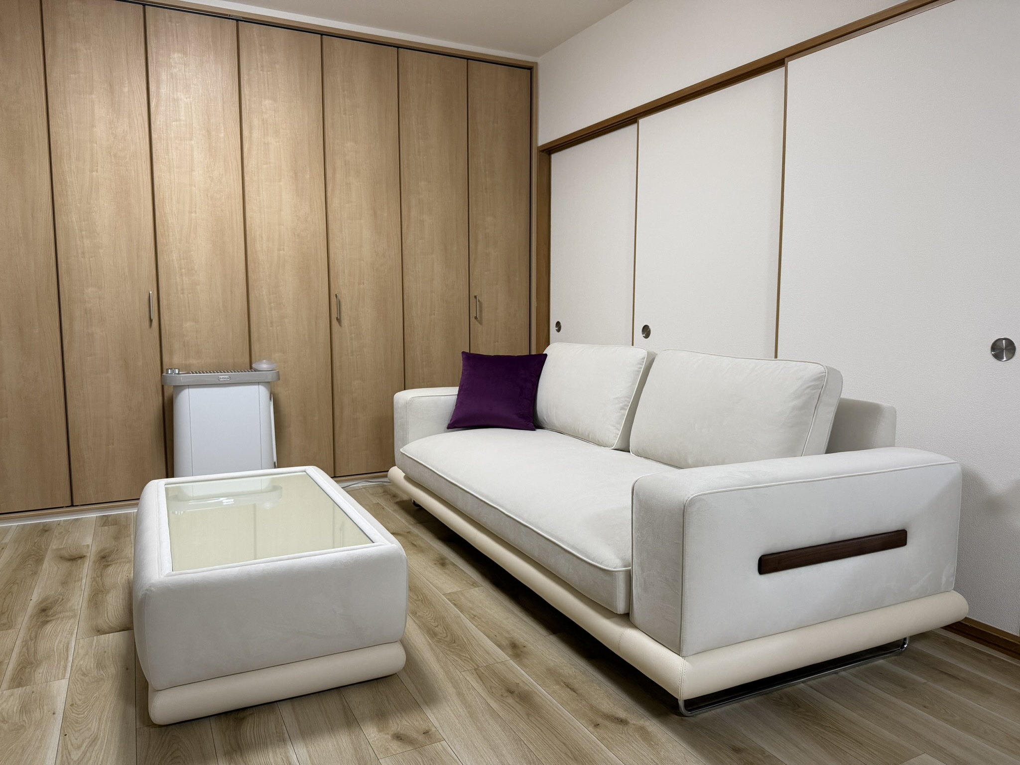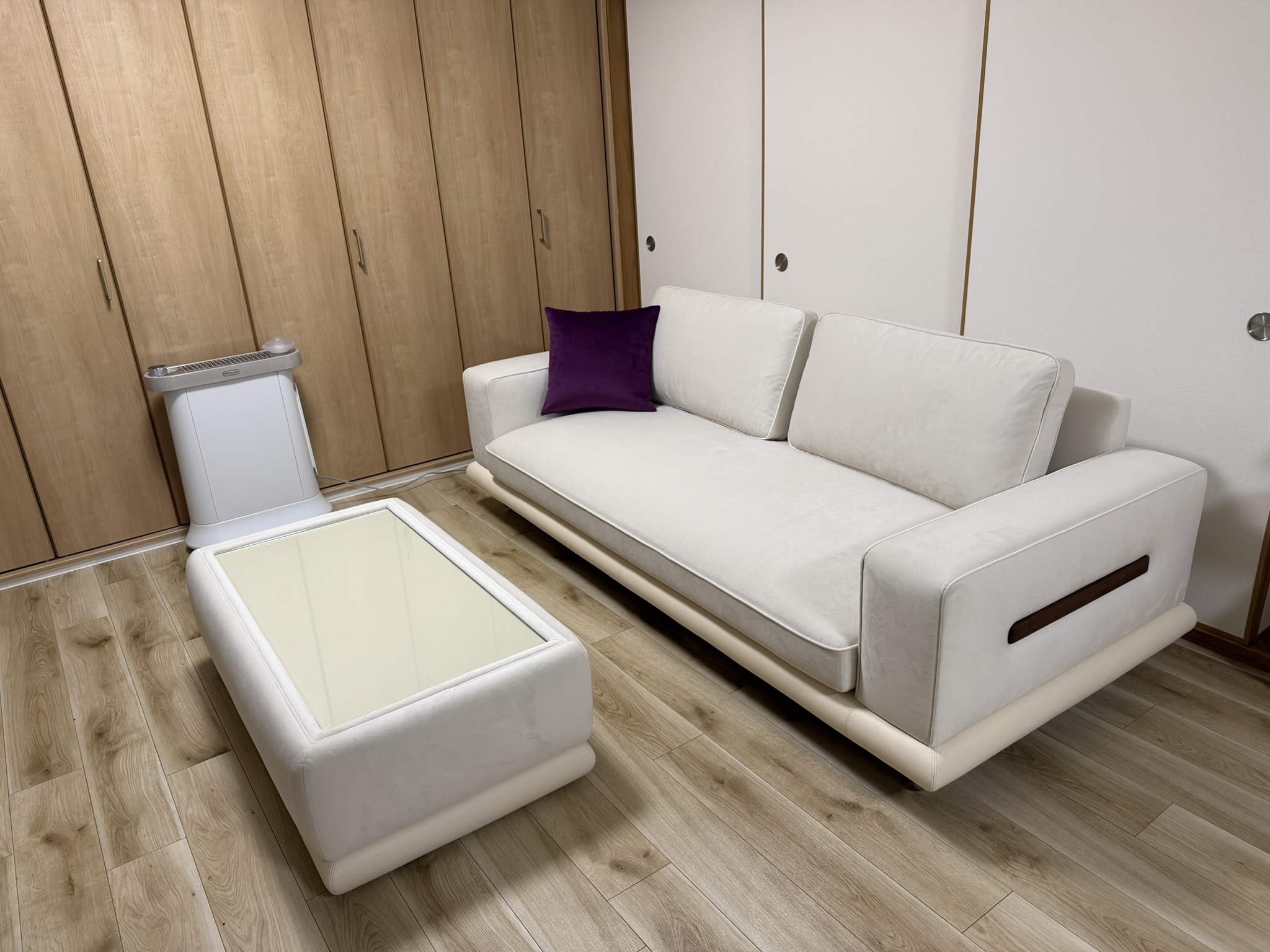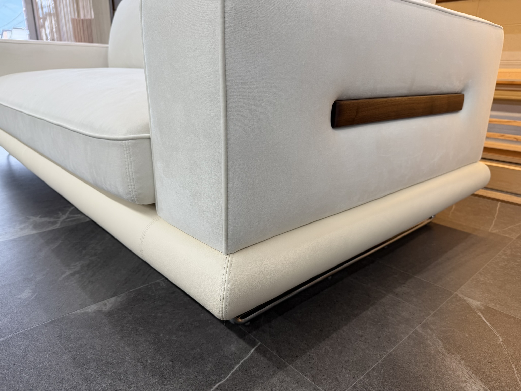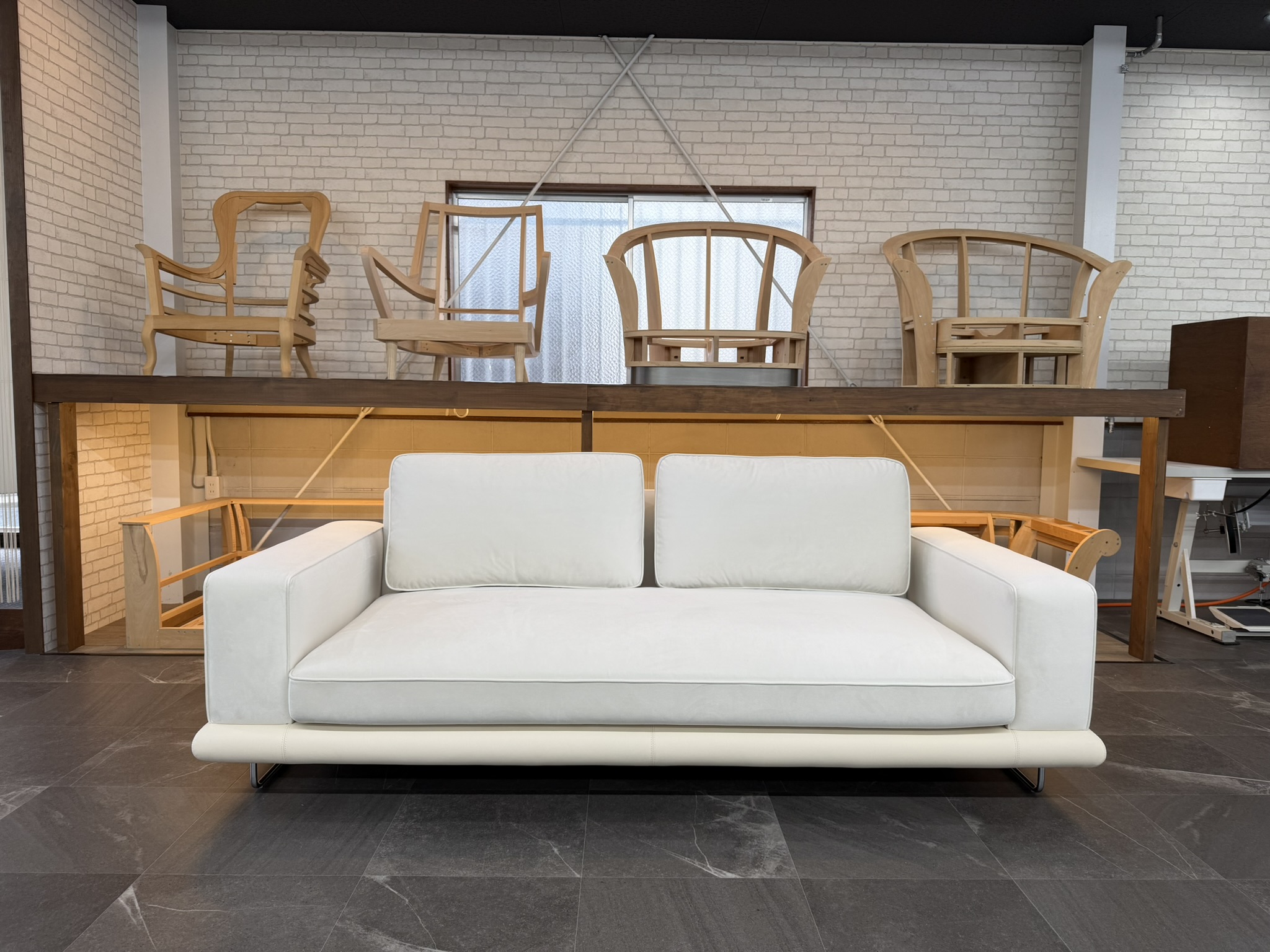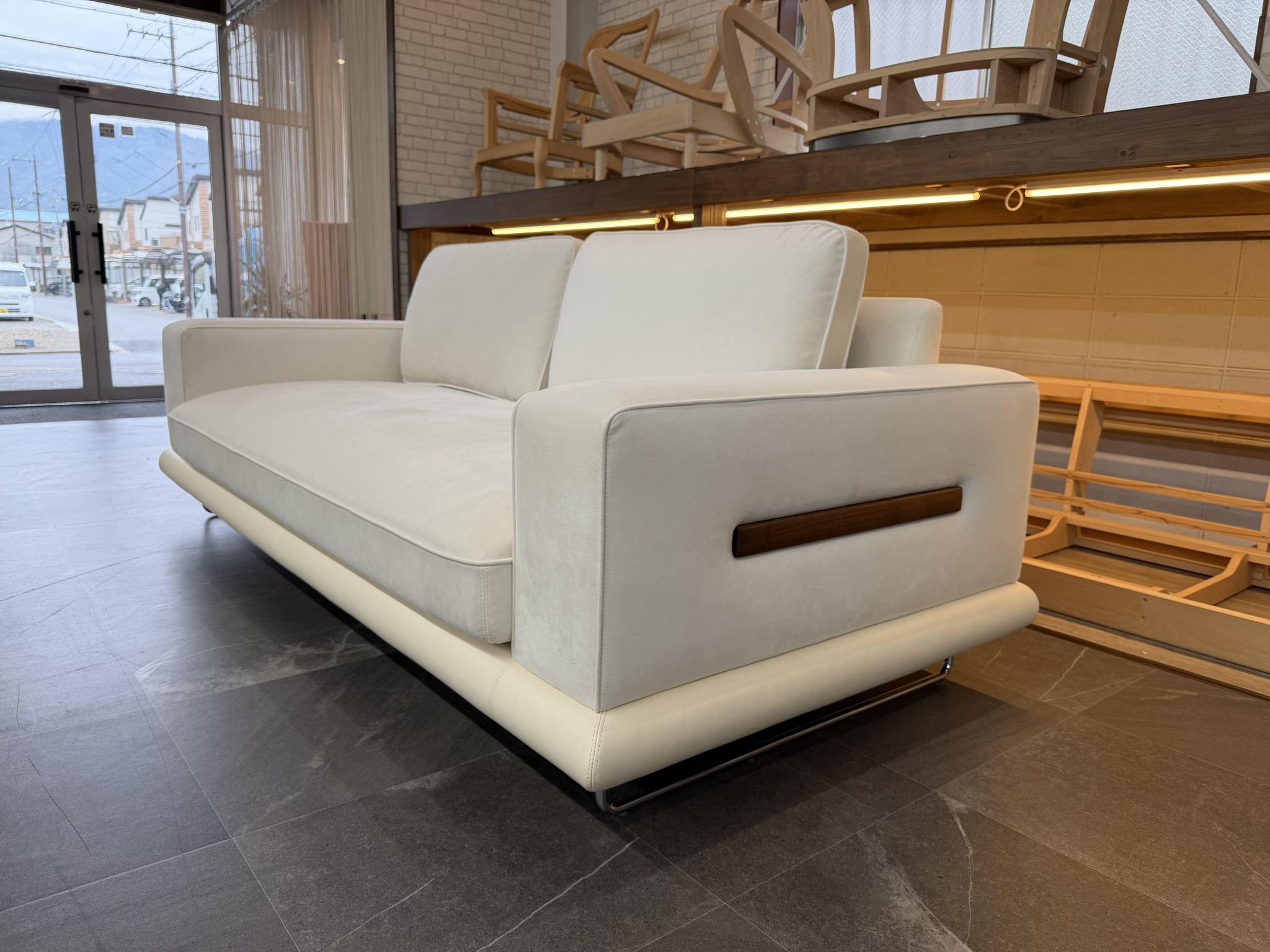 張地には、ソファ本体にホワイトのベルベット、台輪部分にはホワイトの本革を採用。